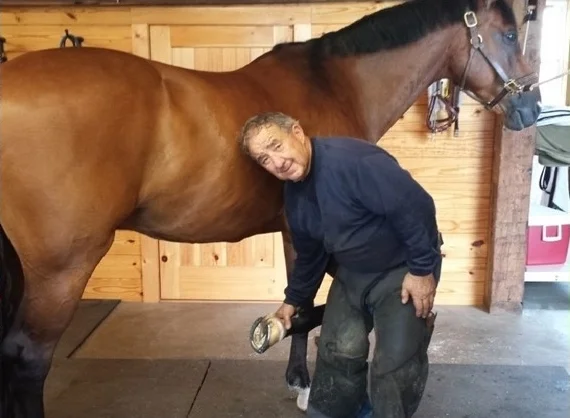 He was introduced to walking and gaited horses and got hooked. He was then interested in Arabs, Hackneys, and Morgans and finally settled to specialize only in hunter & jumpers in 1980. He is known to his friends as the “Road Warrior” as his clients have him flown in to shoe their horses. He is the most respected & well loved farrier on the hunter and jumper circuit.