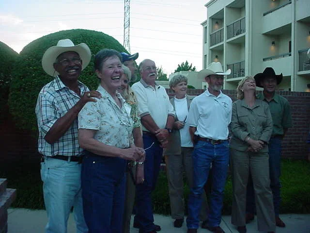 George and Suzanne Goode BWFA Farriers Hall of Fame 2020 ( at far left,) always enjoyed a good laugh (Suzanne passed away in 2020) This photo was taken by the BWFA at a school owner meeting in Oklahoma called together to discuss the farrier education offered by private schools in the U.S. Here are John and Doris Burt of the Arkansas School, Tom McNew of the Alabama school, Reggie and Marcella Kester with Regan Kester and wife of the Oklahoma State Horseshoeing School. Those were good days back then with all of the original school owners.