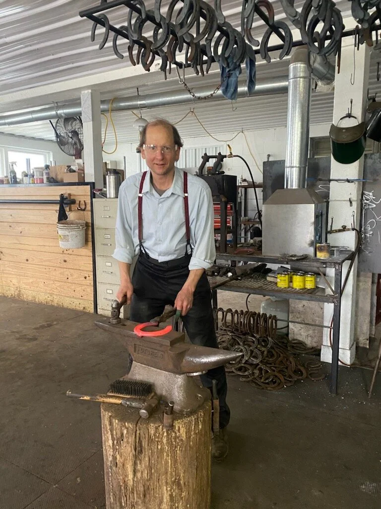 Elam Stoltzfus is truly one of a kind. Any horse would benefit from his work and he is willing and excited to help any horse that he can. In his spare time, he is found hammering away on steel to create tools and/or artistic designs. He seamlessly combines the centuries-old trade of blacksmithing with 21st century knowledge. He is an old-fashioned blacksmith using his advanced skills in shaping metal to perfect the art of shoeing. Wherever he works Elam brings with him knowledge, experience, professionalism, kindness, and a desire to do the best possible trim or shoeing job. He looks at the horse as a whole and not only the feet.